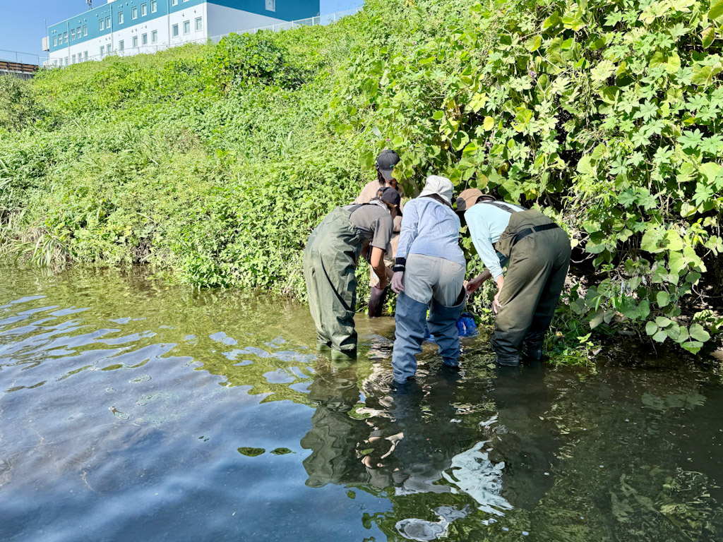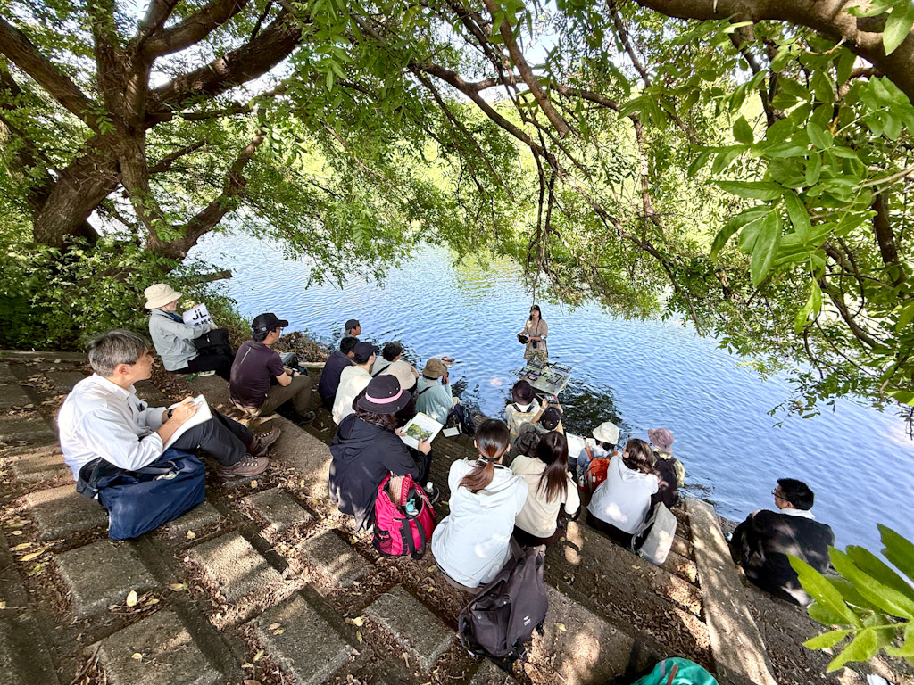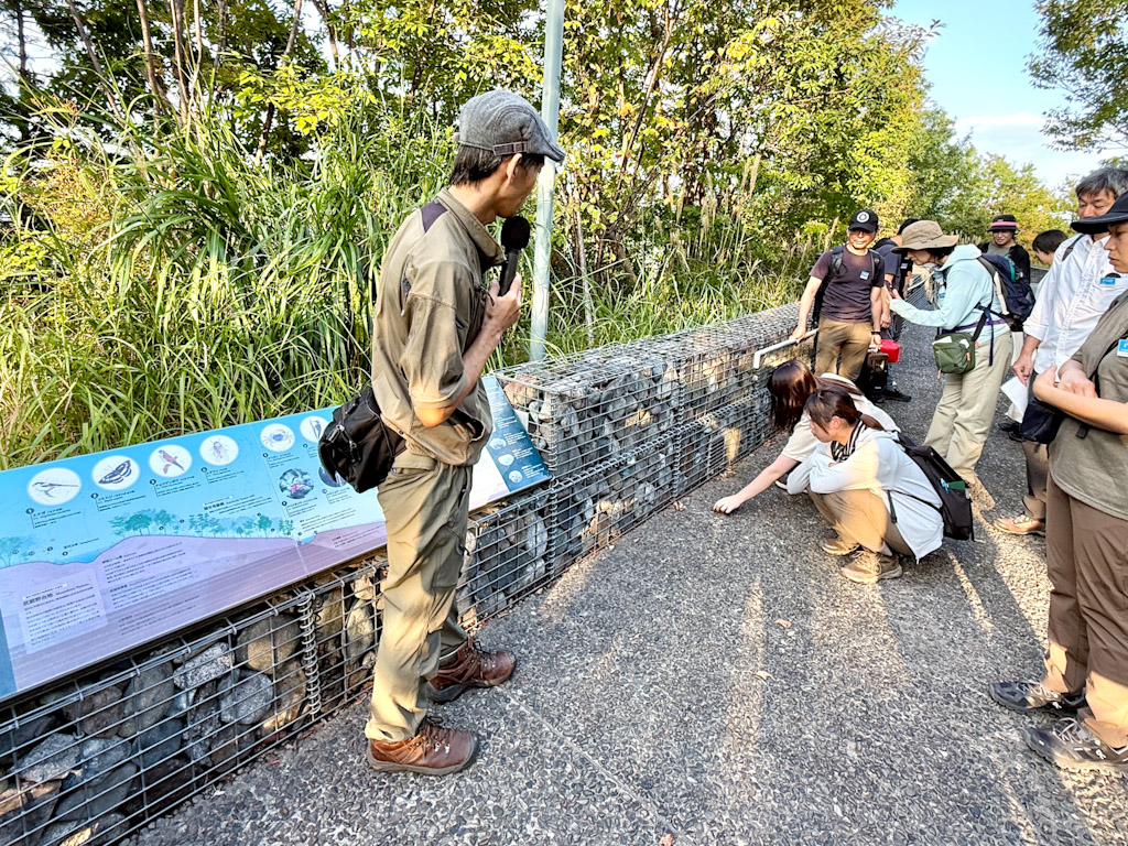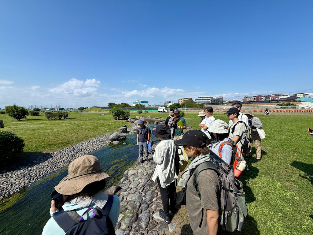 更に、二子玉川ライズの見学に先立ち、NPO法人世田谷水辺ネットワークさんのお力を借りして、エコミュージアム計画の原風景でもある多摩川(野川)の自然を体験しながら、生きものが豊かになる水辺の構造についても学びました。