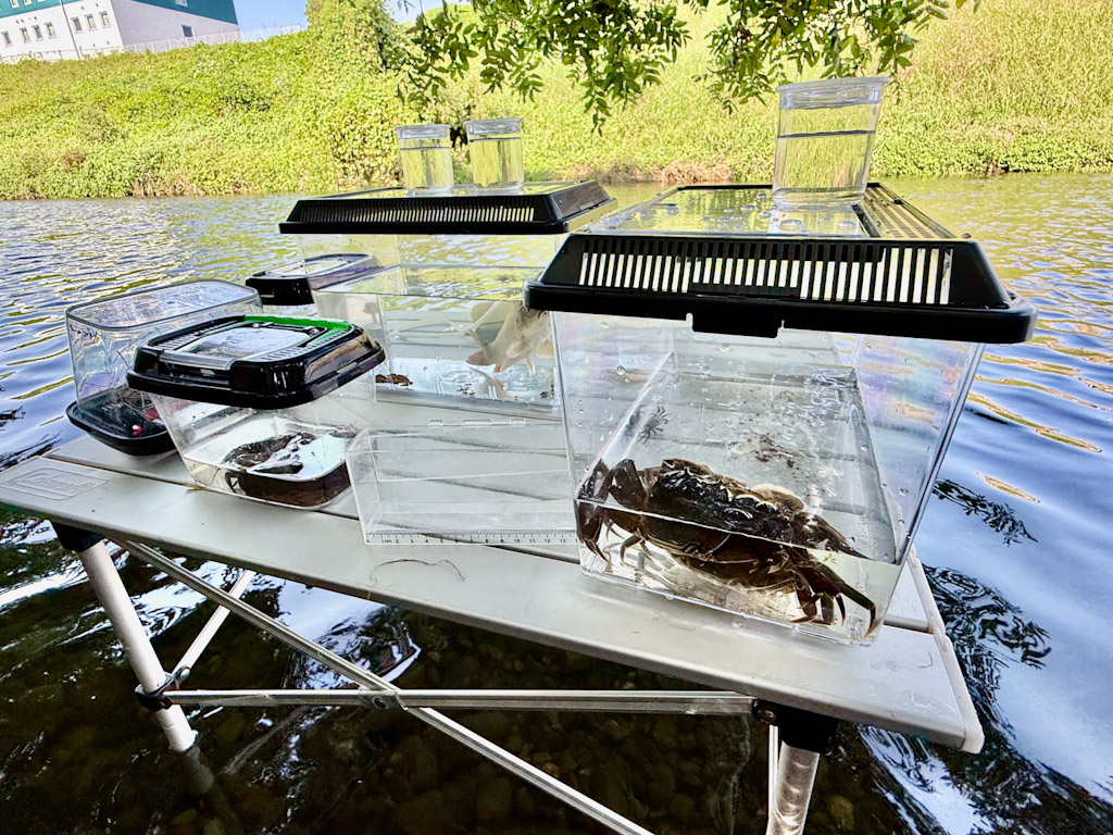 自然体験・河川生態学習は、多摩川の支流の「野川」で実施しました。野川では、講師の工藤さんが、直前に周辺で採取したカニや魚などの生きものと共に、我々を待っていてくださいました。