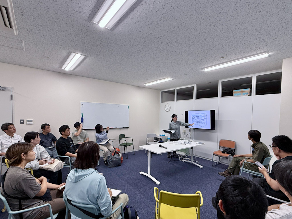 見学終了後は、二子玉川ライズ施設内の会議室をお借りして、座学形式で引き続き講師のお二人から設計時・施工時についてのお話を伺いました。雨水利用のコンセプトの詳細や、竣工時と最近の写真の比較などをご説明いただき、完成から10年が経過した空間の成熟や、運営体制等についてもお話を伺うことができました。質疑応答では講師・参加者を交えて積極的な交流が行われました。